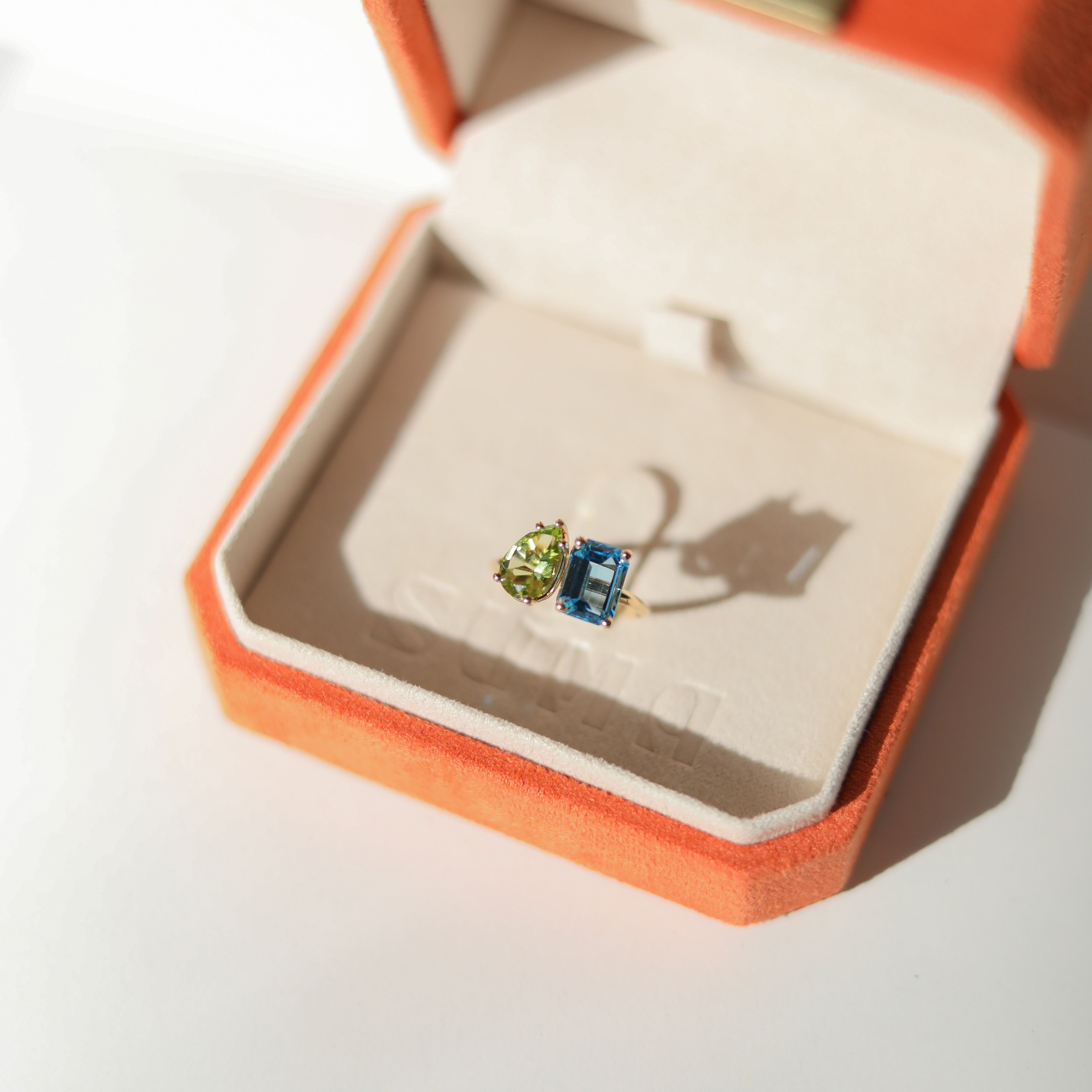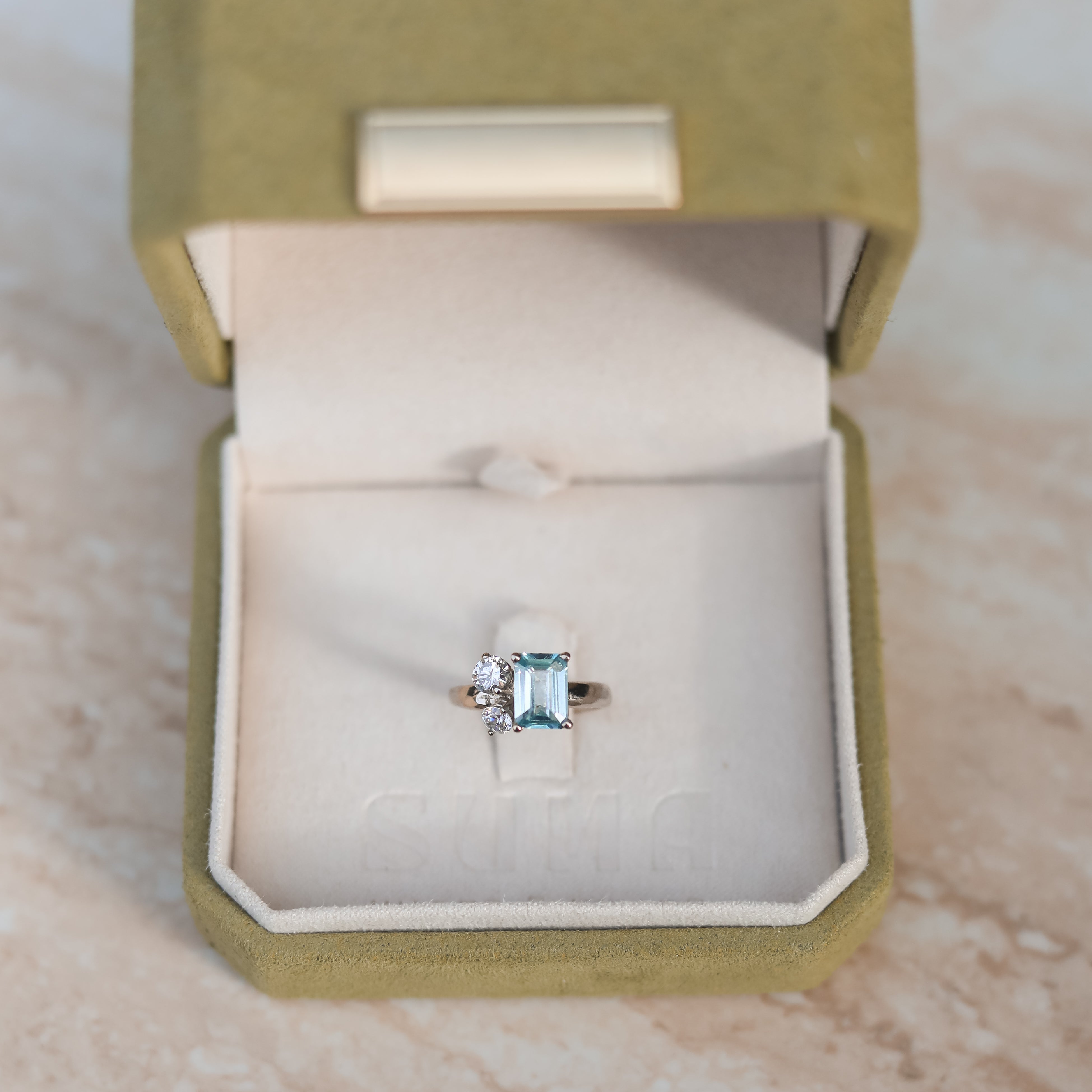 Updated engagement ring made with the birthstones of the couple's sons (Peridot and Aquamarine).