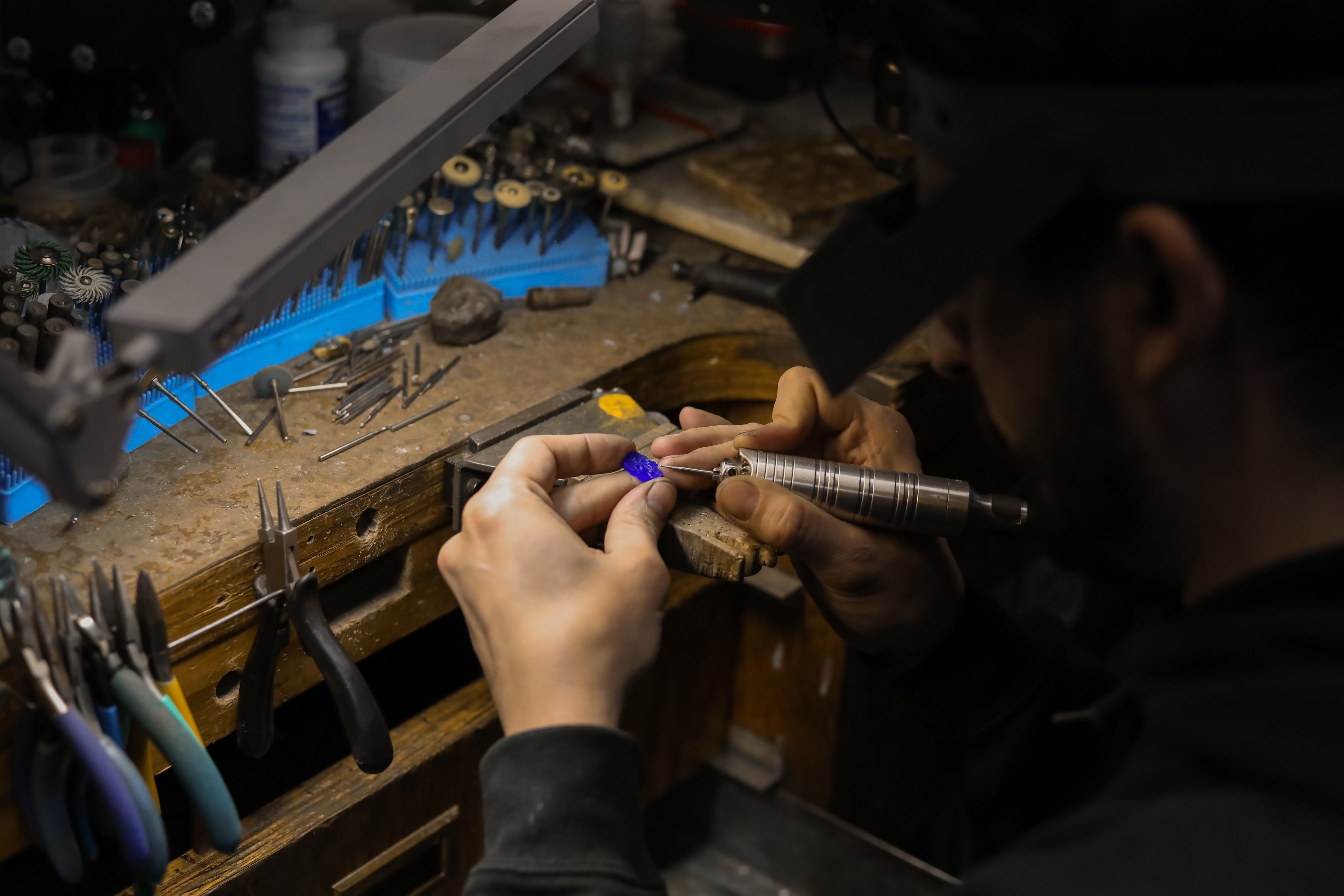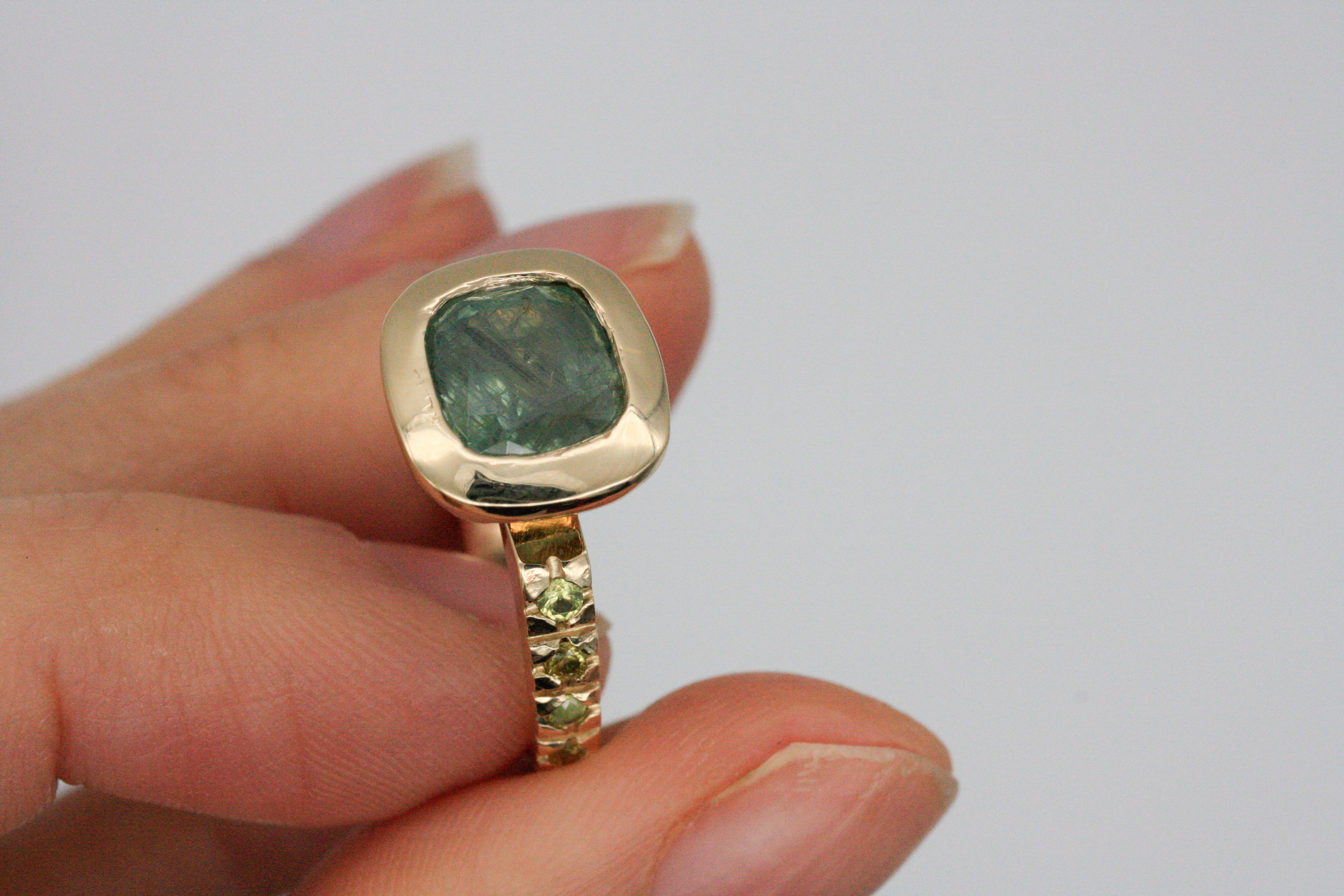Upgraded wedding ring with hand-carved band, flush set Peridot stones and Columbian emerald in handmade bezel.