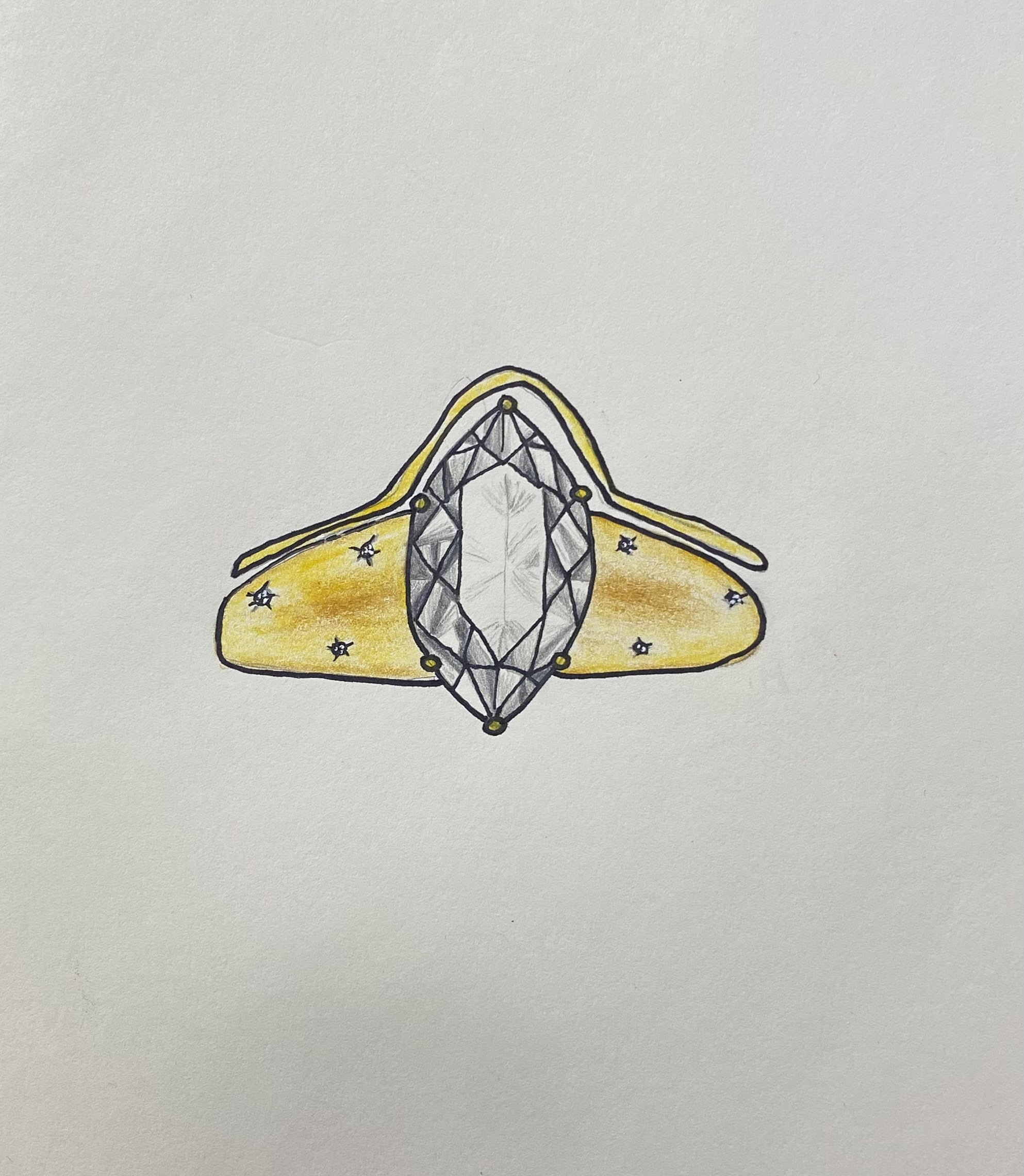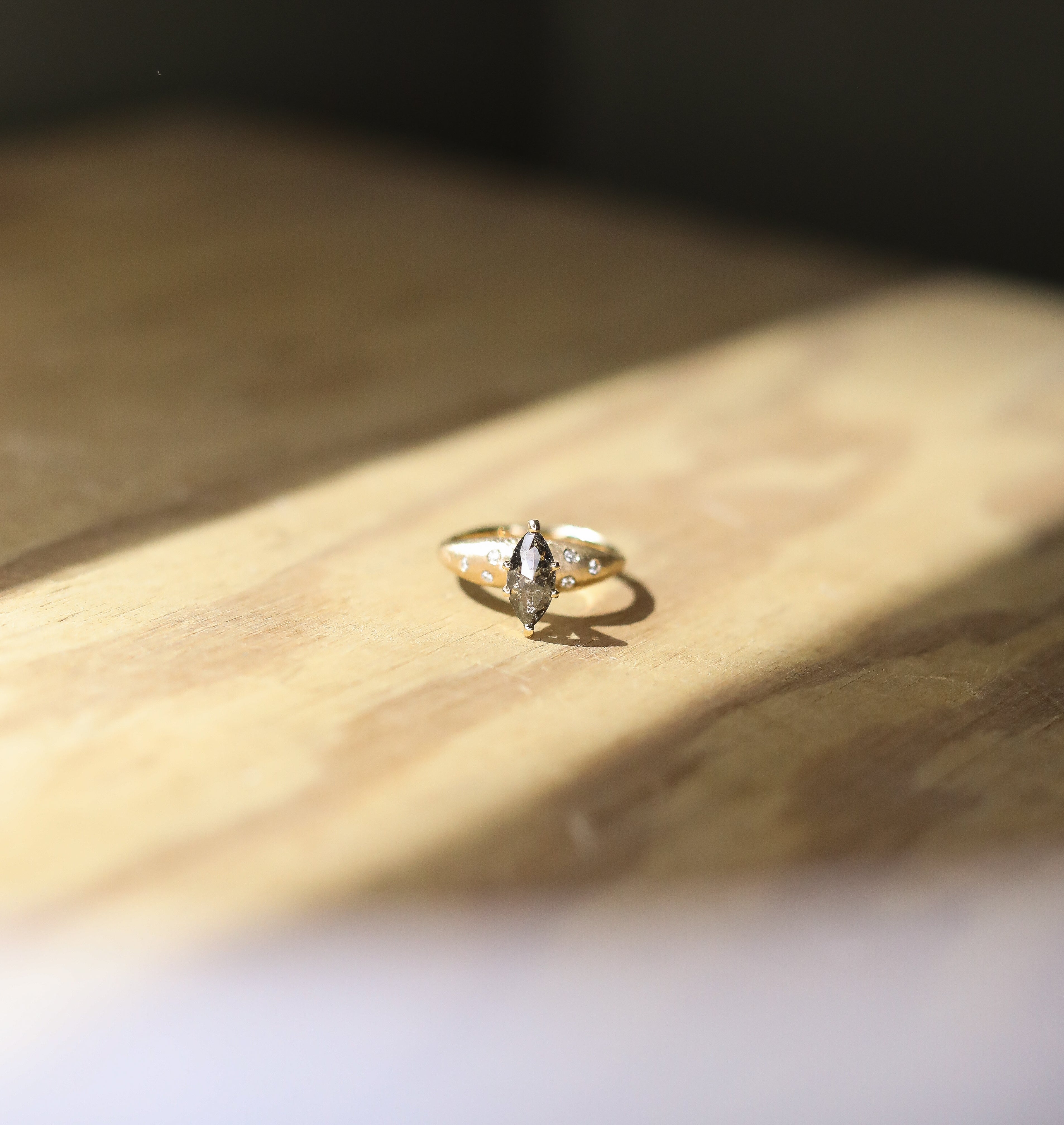 Hand-carved brushed gold band with handset melee diamonds and a marquise salt and pepper diamond.