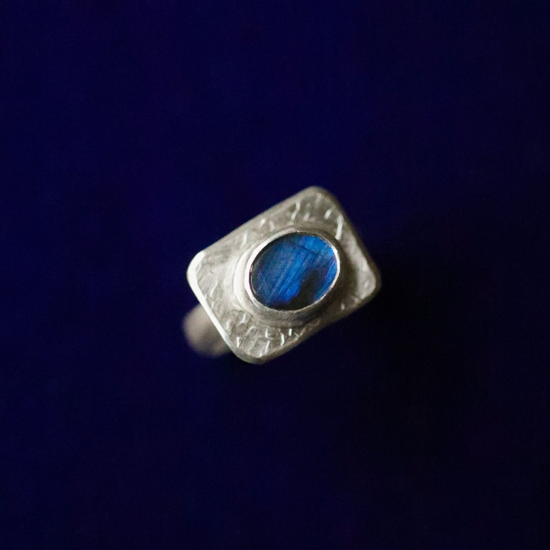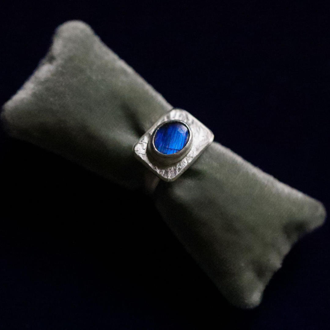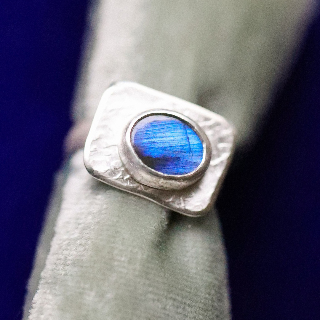 This handmade ring combines a bold design with a touch of mystique. Crafted from textured sterling silver, it features a stunning labradorite gemstone, showcasing its signature flashes of blue and green as it catches the light. The geometric silver setting adds a modern, sculptural element to the piece, while the vibrant labradorite provides a captivating focal point.