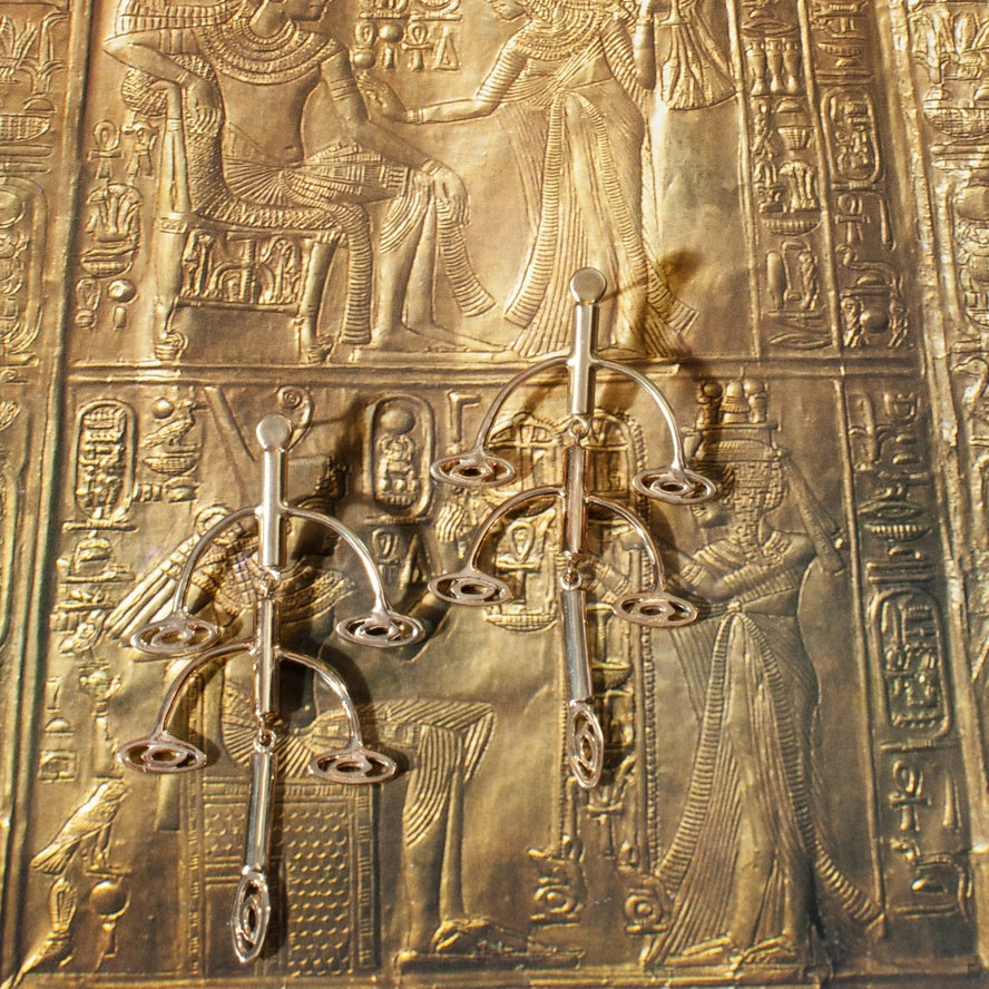 The Esna Earring, a golden mobile adorned with many eyes, captures the essence of the ancient gods of Egypt. As it sways gently with each step, it reminds us of the ever-watchful gaze of the divine, and the mysteries that lie within. A statement piece fit for a pharaoh or a modern goddess alike.