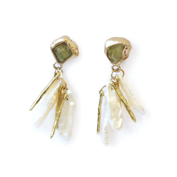 Freshwater biwa pearls and hand carved brass cascade from rough green garnet embedded in brass.