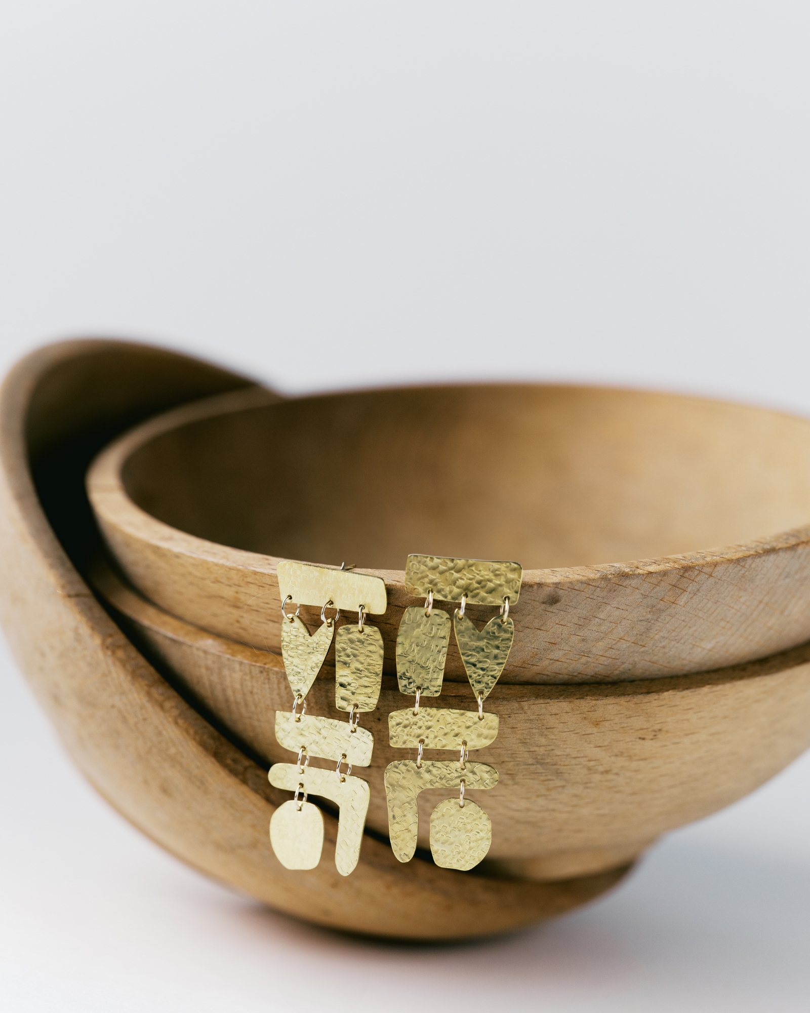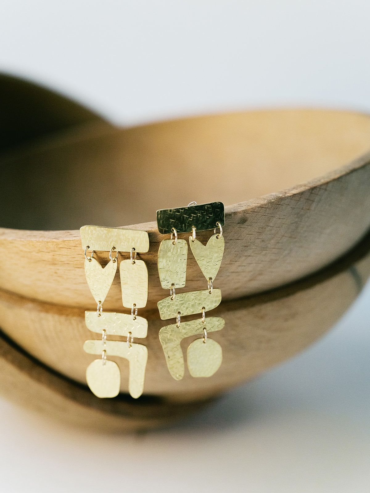 Bold, textural, and full of movement — the Forma Earrings are handcrafted from 18k gold-plated brass and finished with a rich hammered texture. Each geometric shape is individually cut and connected to create a sculptural cascade that sways with you. Lightweight despite their statement-making size, they bring a touch of modern artistry to any look.