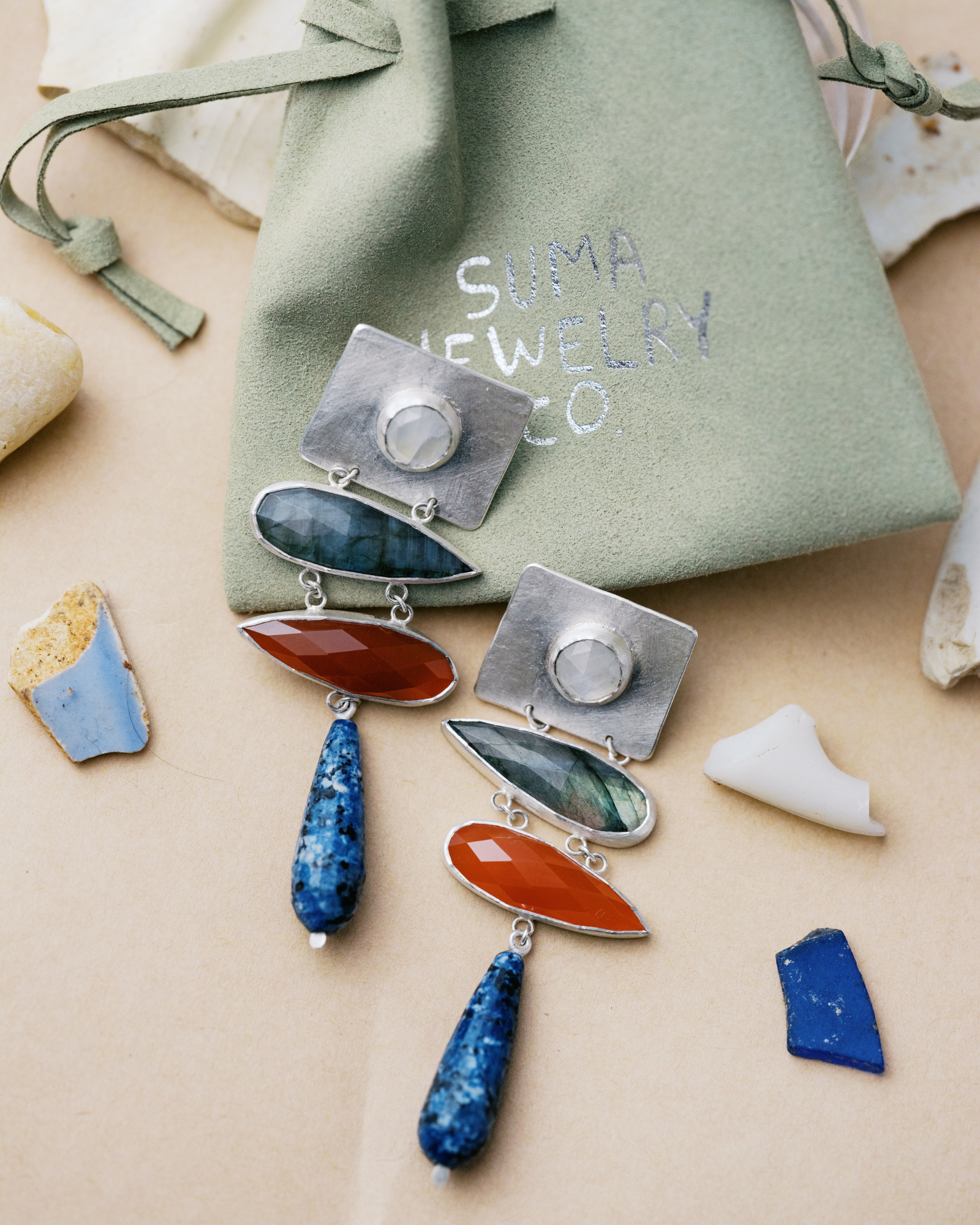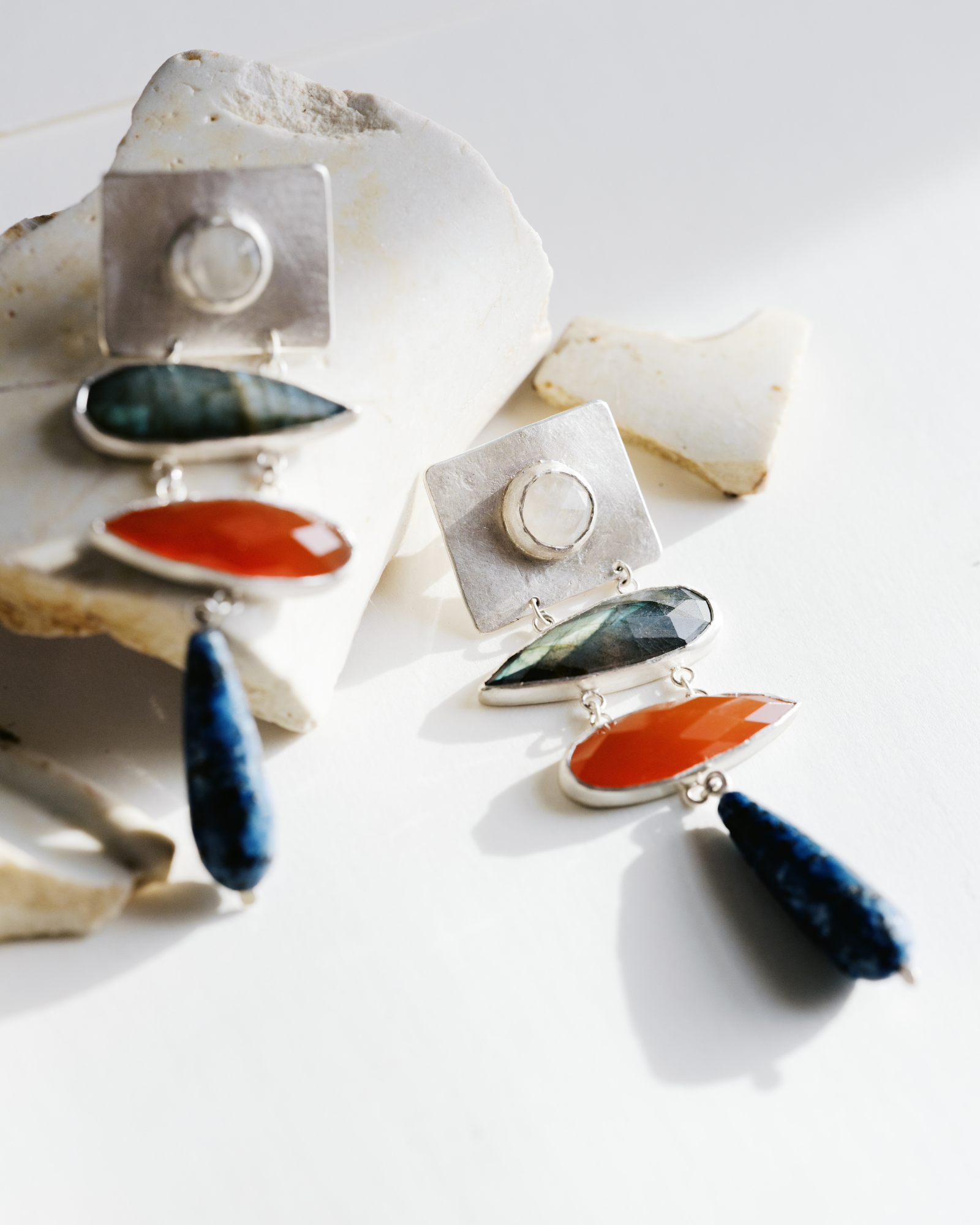Materials: Sterling silver, moonstone, labradorite, orange onyx, and lapis lazuli.