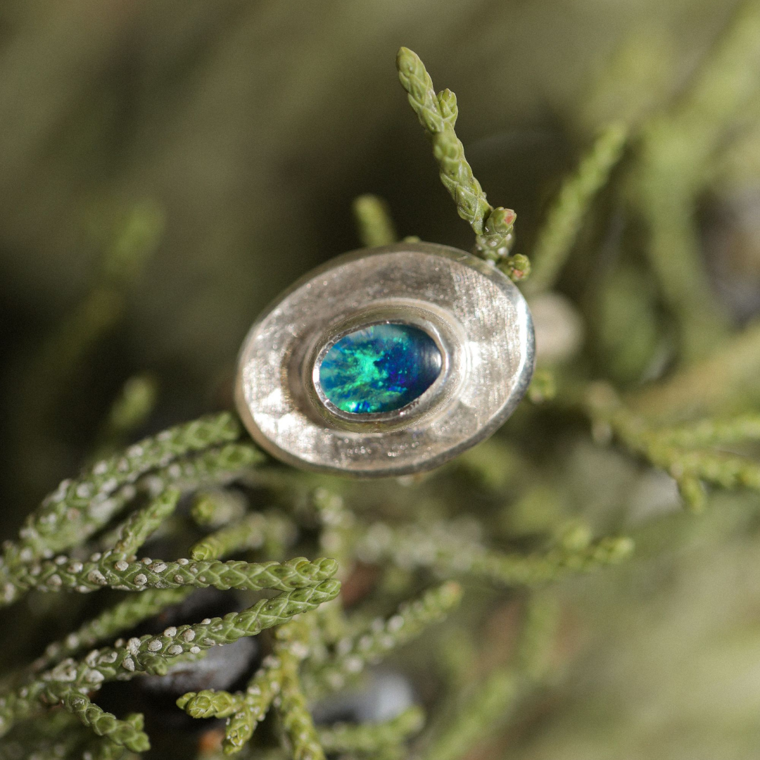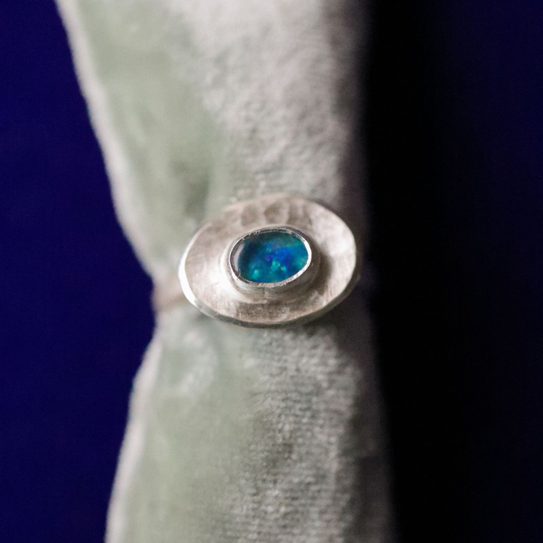 This handmade ring is a striking blend of minimalism and organic beauty. Crafted from textured sterling silver, it features a captivating opal triplet at its center, radiating flashes of vibrant blue and green hues. The design emphasizes the opal's natural beauty, with its bezel setting and softly rounded shape evoking a sense of timeless elegance.