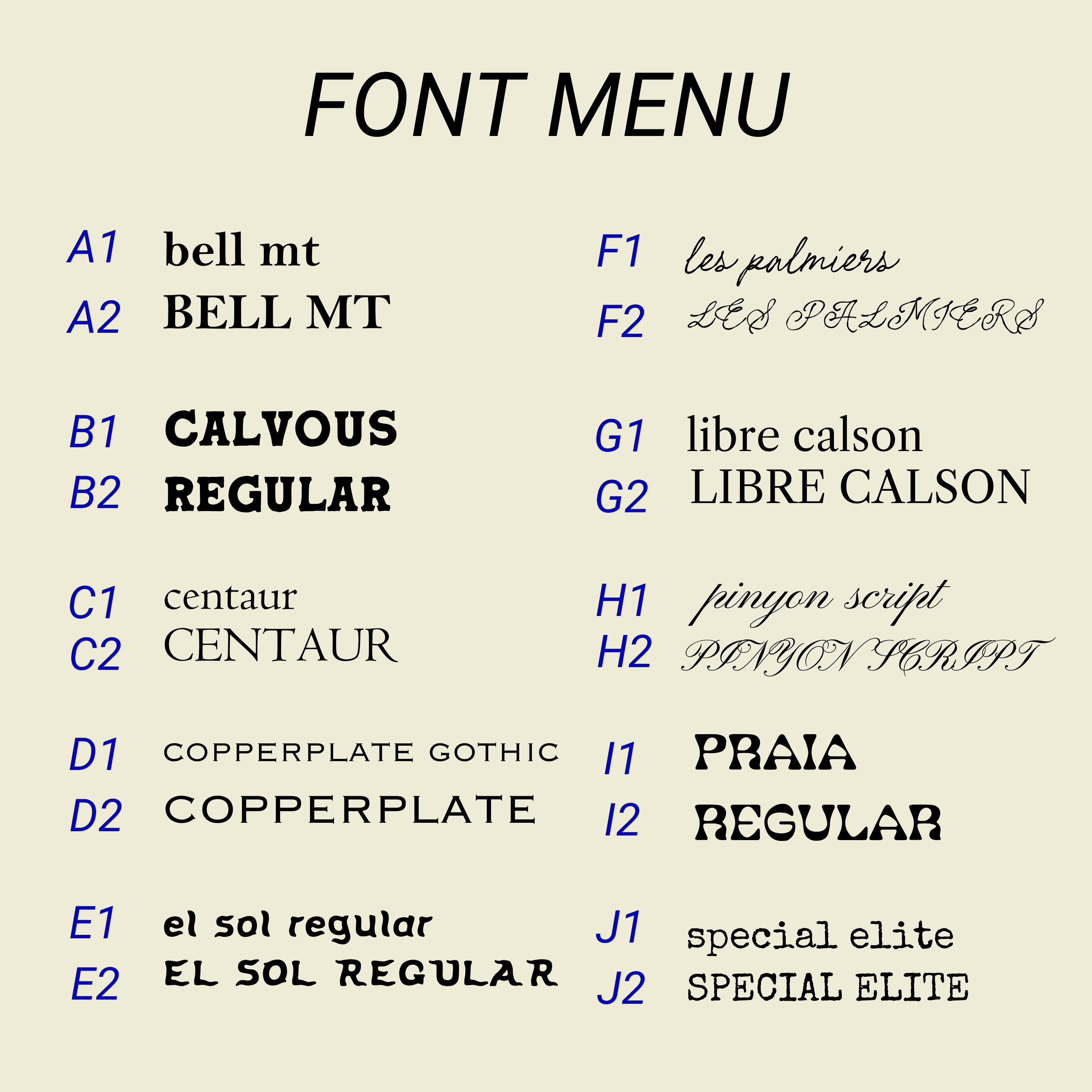Engraving: Please select a font from our font menu, include the engraving of your choice: (can be date, initials or one word) and add it to the "Leave a note about your order" section.