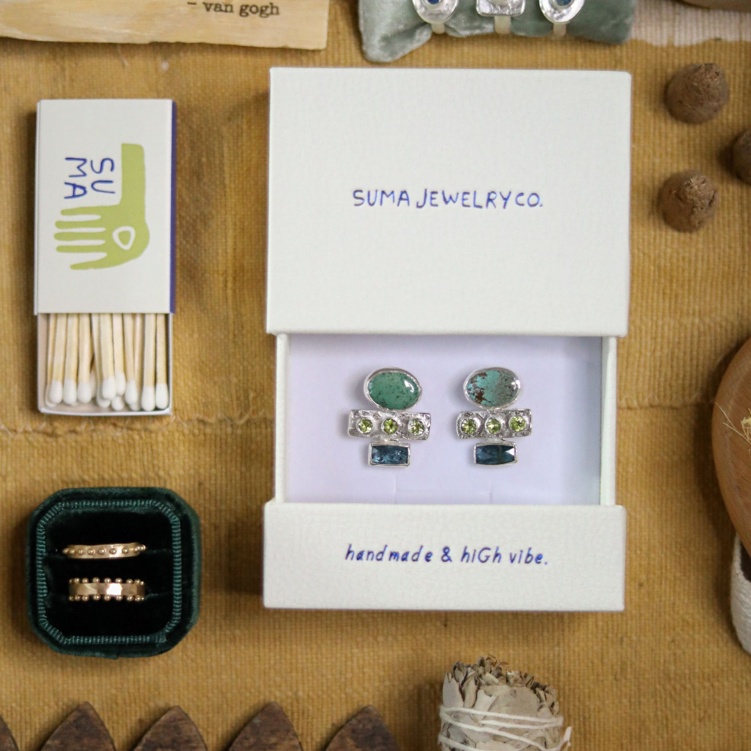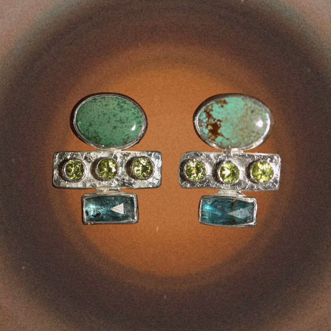 These bold handmade earrings are a vibrant celebration of natural elements, featuring a striking combination of turquoise, peridot, and teal moss kyanite. The oval turquoise stones at the top add a grounding, earthy charm, while the trio of sparkling peridot gems brings an energetic, fresh green hue. Anchoring the design is a rectangular teal moss kyanite with unique inclusions that shimmer like sunlight on the water. The textured sterling silver settings tie the elements together with an artisanal edge, making these earrings a perfect statement for those who love earthy elegance with a touch of modern flair.